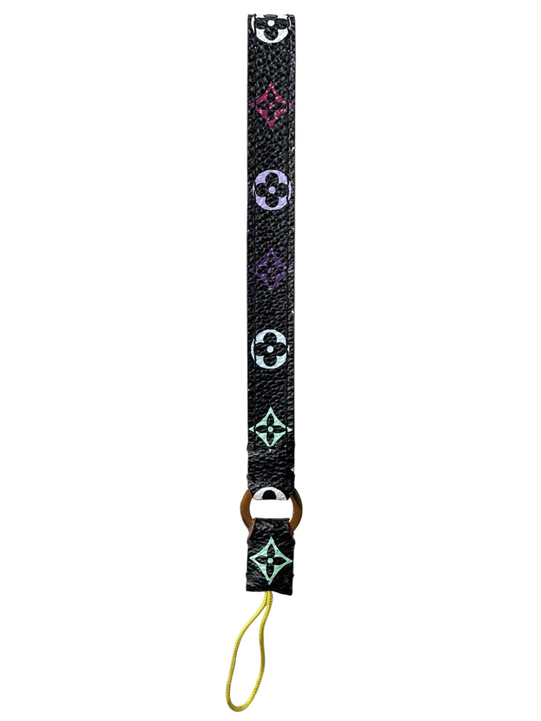 Exterior: Black coated canvas multicolor monogram throughout. Takashi Murakami x Louis Vuitton collaboration. Can be used as a phone charm, as a keychain, or bag charm.